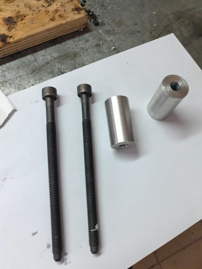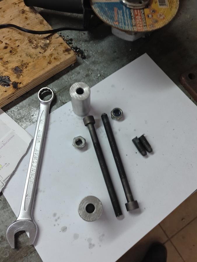 Решил поднять на 50мм. с помощью алюминиевых проставок. Выточил из алюминиевой заготовки втулки высотой 50мм, диаметром 26мм центральное отверстие 10мм. Болты использовал от ГБЦ какой то китайской машины, подошли идеально и по головки и по шагу резьбы, как родные только длинные. Болты укорачивание до нужной длины. Длинны тросов газа и сцепления хватает без проблем на этот подъем. Вот и конечный результат! |