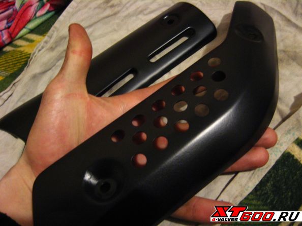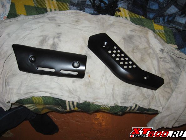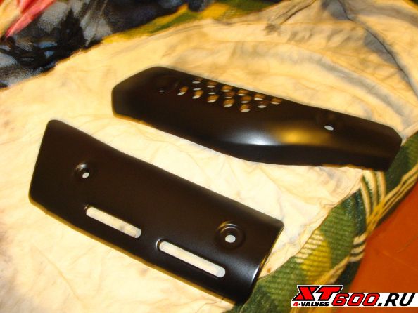 Сейчас успешно испробовал новый (для меня) способ покраски некоторых запчастей. Сложность в том, что краска должна быть термостойкой, так как окрашиваемые детали - части выхлопной системы. Попробовать я решил на декоративно-защитных щитках, один из которых защищает ногу пилота от выхлопа, а второй - ногу пассажира от глушителя.