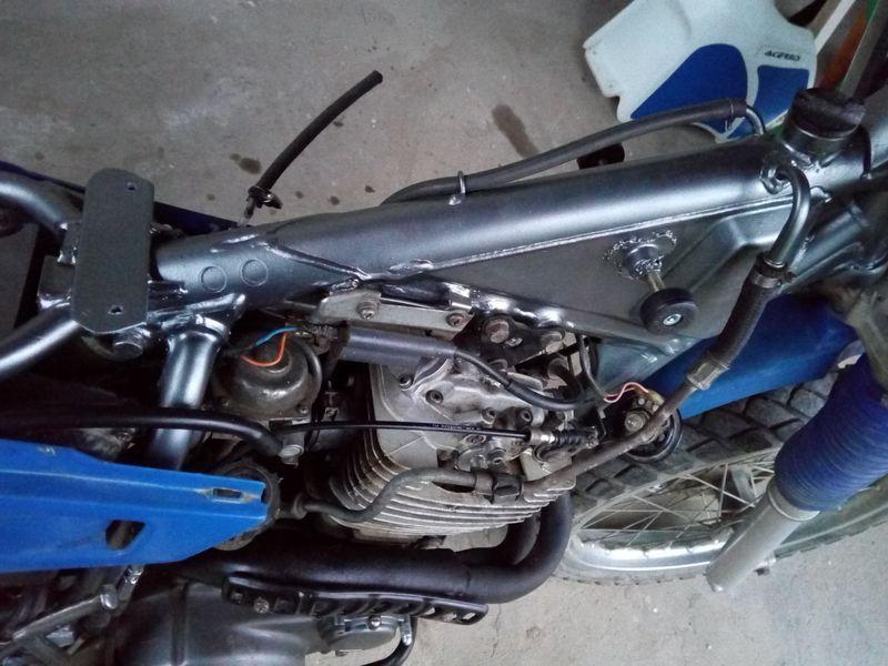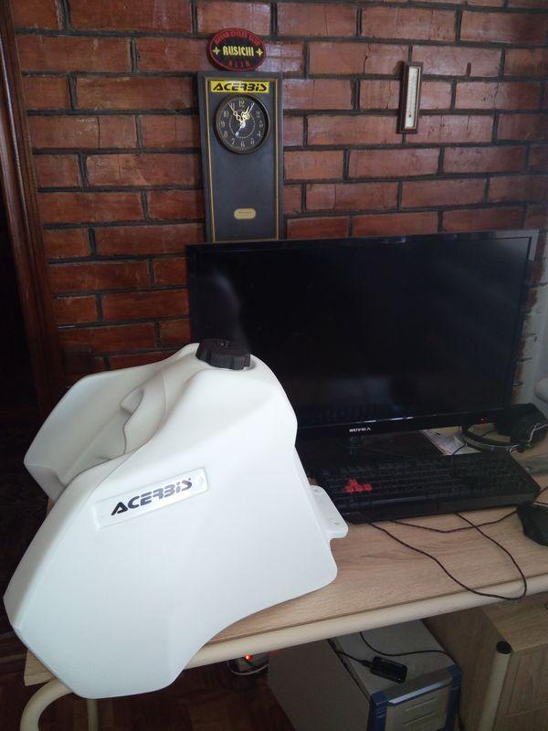 После длительного курения форумов, просмотра и сравнения фото разных баков - выбор был сделан в пользу бака Асербис для Сузуки DR650 до 95 года, объёмом 6,6 галлонов. Бак без доставки обошёлся мне в 10,5 т.р., в комплекте краны и крепёж. Тройник сразу выкидываем, и ставим металлический от жигулей. Ставится бак практически на родные места - при этом крышка маслобака доступна, спереди вместо резиновых подушек приварил гайки для болтов, заднее крепление срезал и приварил новую полочку под два отверстия. У основы седла пришлось подрезать бока на передней вертикальной части и нарастить сверху - после чего оно встаёт на штатное место.