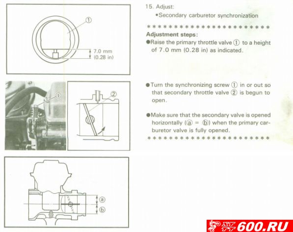 1. Выставите заслонку основного карбюратора на высоту открытия 7 мм как показано на рисунке. Проще всего это сделать, засунув туда карандаш или трубку диаметром 7 мм. 2. Поверните винт синхронизации таким образом, чтобы заслонка второго карбюратора начинала открываться при таком положении. 3. Проверьте чтобы при полном открытии заслонки основного карбюратора заслонка второго была в горизонтальном положении (тоже полностью открытой). Редактировалось: 1 раз (Последний: 4 октября 2012 в 20:32)