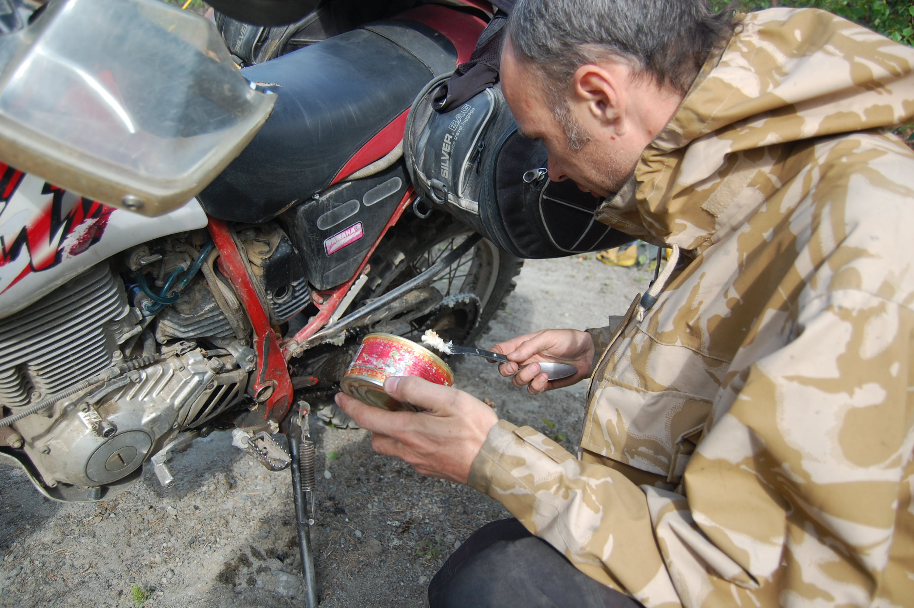 Кажись не было еще темы такой ))) Казалось бы все просто, но хотелось бы услышать опытных и сам могу поделиться информацией из своей мотопрактики. Рядом с домом я всегда мажу цепь отработкой, любой. Делаю это вараварски, вывешиваю колесо и поливаю из масленки типа такой: Мазать из шприца каждое колечко оринга у меня не хватает терпения, пробовал. В дальние поездки брал баллончики фирменной смазки. Она, эта смазка, замечательная, держится дольше, процесс смазки чище, вещи не так забрызгивает. Но этих баллонов надо возить несколько (езжу далеко, в семье два мотика). А тут в нашей семье появилась Хонда Баха, в которой за время путешествия я меняю масло 1-2 раза. Вот и начал я в пути тоже мазать отработкой цепи, не выкидываю его после замены. А до первой замены мне хватает одного баллона фирменной смазки. В последней поездке я открыл еще один вариант смазки цепи, салом. Я серьезно! Отличная смазка цепи! Доедая очередную банку тушенки, мы в очередной раз отказались есть белый жир/сало в ней, холестерин однако, и тушняк жирный достаточно и без этого сала. С одной банки я смазал одну цепь, хватило до дома (1500 км асфальта). Вот пример бережливого использования ресурсов, рекомендую )))
