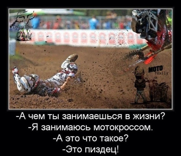 Sasa,первое правило в мотокроссе какое,не знаешь? - Нельзя ехать быстрее,чем можешь! Второе!. - Лучше гипс и кроватка,чем гранит и оградка ! Если с физухой слабо,наката мало,на руках вязанные перчатки,на ногах кирза, на голове китайская папаха за 1200 руб.,то старайся не вваливать,не разбивай себе голову,а мне сердце ... А вообще сегодня по ящику Гран-при Аргентины по кроссу, посмотри,там все едут криво - тебе понравится.