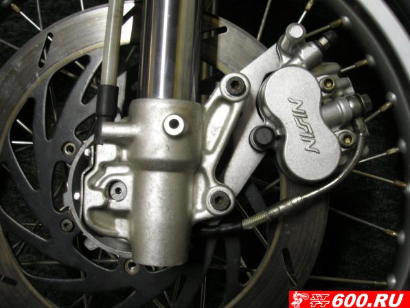 Если использовать передний суппорт c железной скобой, то нет проблем поставить вперёд любое колесо. Достаточно изготовить другую скобу суппорта. На фото я собрал в кучу вилку от TT600S Belgarda, суппорт от ХТ600 и 19-ти дюймовое переднее колесо с тормозным диском 300 мм от Aprilia Pegaso650. Кстати, скобу сделал в домашних условиях, с двумя вариантами крепления ( две пары отверстий) - для дисков 300 и 320 мм. С Brembo такой вариант не прокатит, нужно делать переходник, а лишние сочленения я не люблю - поэтому задействовал Nissin. Хотя при желании можно и Brembo установить...