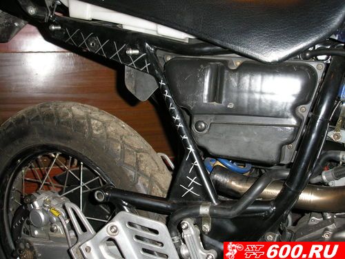У тебя рама начиная с 1994 года - DJ02, 4PT. До этого у 3ТВ штатный глушитель включён в силовую схему, выполняя функцию поддержки подрамника ( крепления сиденья). Из-за этого правая задняя часть рамы в области сиденья явно прослаблена, она фактически висит в воздухе, подпираемая лишь глушителем. При его замене на тюнинговый или даже при простом ослаблении затяжки штатного глушителя( мой случай) рама тупо деформируется. Правда трещин не видел ни разу. Это место откровенно требует усиления. При замене штатного глушителя программа минимум - съёмная распорка в местах крепления родного глушителя. Я пошёл другим путём - вварил трубу с косынками ( на снимке помечено крестиками).