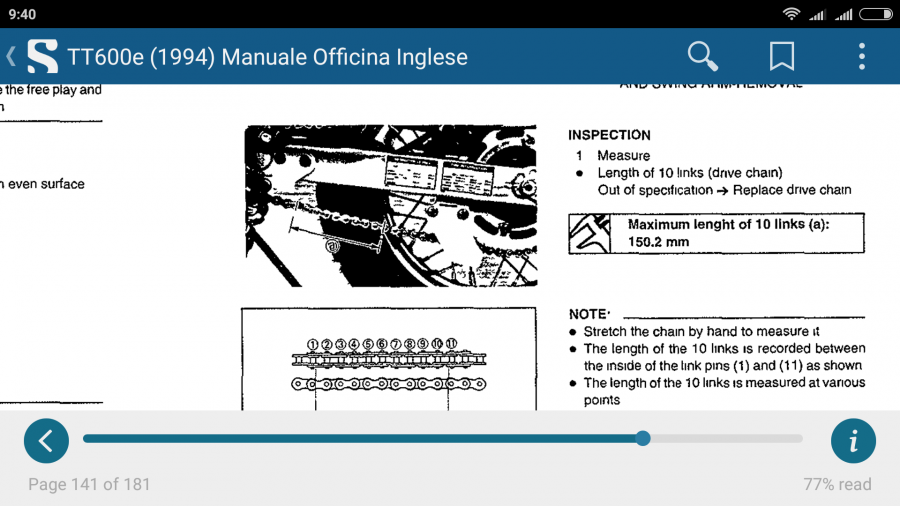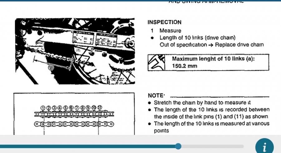 вообщем на этой картинке из мануала написан полный бред. Купил новую цепь дид vx2 520. Зделал замер как в мануале,между 10 звеньями уменя получилось все 153мм. Если верить этой писюльке,то выходит что новую цепь пора выкидывать)))