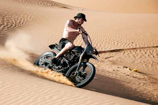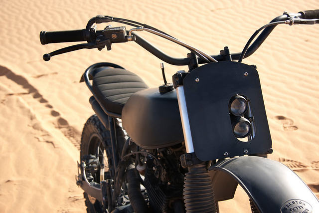 Up front, Boy has shaved the top triple tree and positioned the bars a little bit lower than usual. He’s also made a frontplate housing two compact lights—a modern take on the desert sled look.