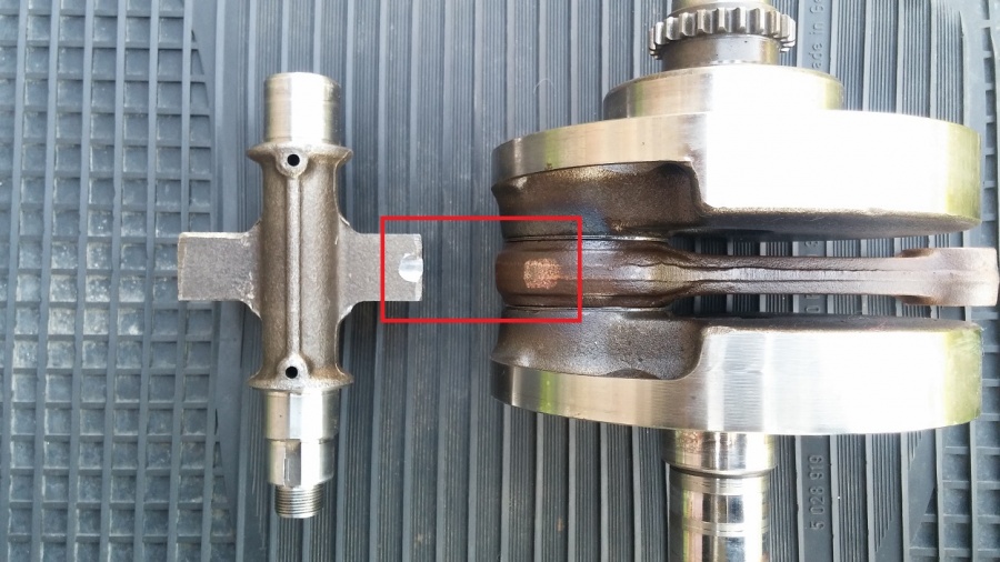 Так что нет там на нее нагрузки. Вообще никакой. Про балансирный вал. Ну там сложнее немного. Там потому что 60 н-м. Но в любом случае с завода это соединение нормально фиксировано. Усталостные напряжения конечно никто не отменял. Но если стопор стоит и его усико нормально загнуто. То соответственно гайка то никак не открутится. Натяг может со временем чутка упасть. От этих усталостных напряжений. А т.к. 60 н-м, не так уж и много. По сравнению со 150 н-м ). То за долгие годы, возможно какую-то нагрузку шпонка и начинает воспринимать. Соответственно это нерасчетный режим работы. И как вода камень точит. Так и тут. Шпонку разбивает. Но это нужно время и абсолютно пофигистическое отношение к тем стукам, которые должны будут исходить из двигателя ).Добавлено спустя 6 минут android: Ну норм. Это еще цветочки ). На DR650 при встрече балансира с коленвалом я видел что просто разрывает картер ). Хотя конечно смотря как они встретятся. С каким моментом инерции и на сколько жестким будет встреча. Это же как с машинами. Или встреча на встречных курсах по касательной, как на фото выше. Или "в лобовую" ! Когда вся скорость сразу переходит в энергию смятия. Ну хотя для системы К.В. - Балансир встреча по касательной конечно невозможна. Там так и так будет "лобовое" ). Но все-же последствия могут быть разные. Все зависит от скорости, а точнее от оборотов двигателя, на которых произойдет встреча.Последствия встречи балансира со срезанной шпонкой и нижней головки шатуна. Двигатель ХТ550. |