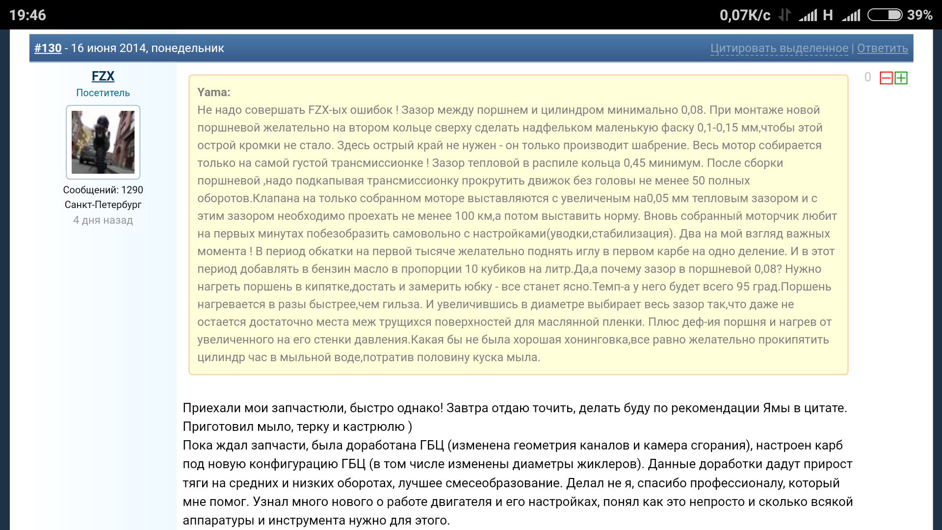 Не надо совершать FZX-ых ошибок ! Зазор между поршнем и цилиндром минимально 0,08. При монтаже новой поршневой желательно на втором кольце сверху сделать надфельком маленькую фаску 0,1-0,15 мм,чтобы этой острой кромки не стало. Здесь острый край не нужен - он только производит шабрение. Весь мотор собирается только на самой густой трансмиссионке ! Зазор тепловой в распиле кольца 0,45 минимум. После сборки поршневой ,надо подкапывая трансмиссионку прокрутить движок без головы не менее 50 полных оборотов.Клапана на только собранном моторе выставляются с увеличеным на0,05 мм тепловым зазором и с этим зазором необходимо проехать не менее 100 км,а потом выставить норму. Вновь собранный моторчик любит на первых минутах побезобразить самовольно с настройками(уводки,стабилизация). Два на мой взгляд важных момента ! В период обкатки на первой тысяче желательно поднять иглу в первом карбе на одно деление. И в этот период добавлять в бензин масло в пропорции 10 кубиков на литр.Да,а почему зазор в поршневой 0,08? Нужно нагреть поршень в кипятке,достать и замерить юбку - все станет ясно.Темп-а у него будет всего 95 град.Поршень нагревается в разы быстрее,чем гильза. И увеличившись в диаметре выбирает весь зазор так,что даже не остается достаточно места меж трущихся поверхностей для маслянной пленки. Плюс деф-ия поршня и нагрев от увеличенного на его стенки давления.Какая бы не была хорошая хонинговка,все равно желательно прокипятить цилиндр час в мыльной воде,потратив половину куска мыла.