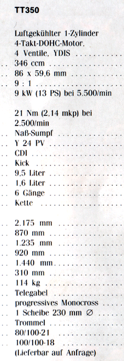 Всё родное, гарантированно. Всё имеет признаки ОДИНАКОВОГО старения. Это радует. Под замену будет многое, как и писал выше: рассохлось, потрескалось, прохудилось и так далее. Начинаем с бензопроводов и воздуха. Заказываю: ремкомплект карбов, резинка топливного крана, прокладки ДВС, воздухофильтр, патрубок муфта между цилиндром и карбюратором, все сальники в ДВС. И это только начало :)Добавлено спустя 5 минутВот товарищ дал. Графу МИНУС даже не гляжу, пофиг :) http://rallye-tenere.net/Stamb_tt_350.htm ![]() ![]() ![]() Правдой дорожить, злу не потакать,