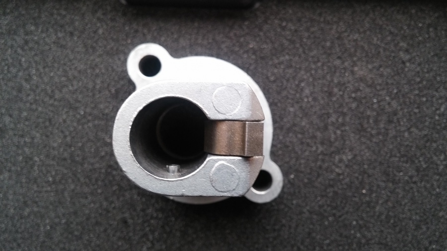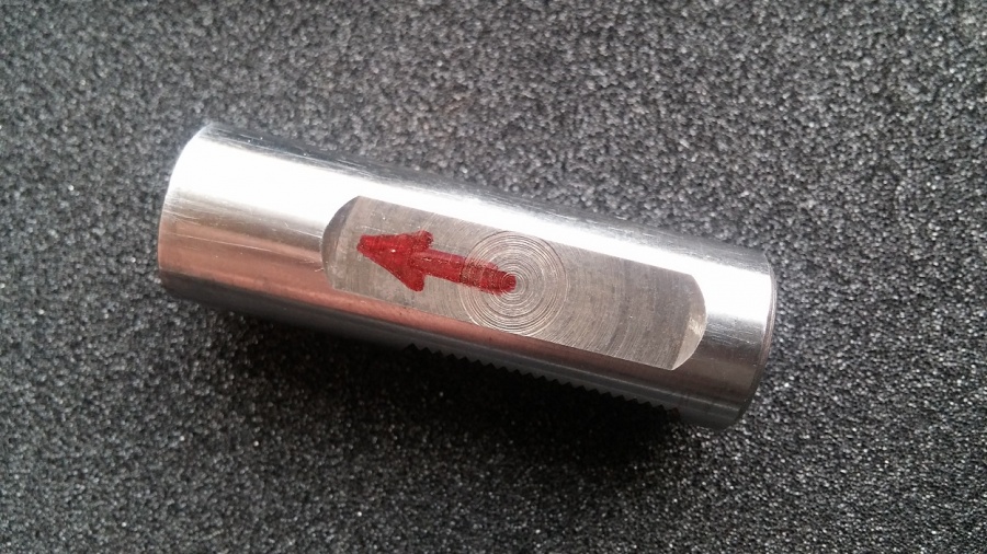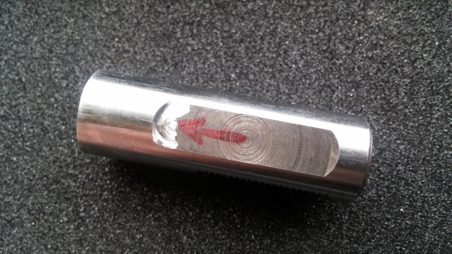Толкатель в оригинале. Стрелка указывает на фаску, которую нужно убрать. Фаска удалена. Фаску со штифта удалил надфилем, вдавив его в корпус натяжителя. Вынимать не стал - без фаски проблемно будет поставить назад. Собрал натяжитель, погонял с отжатым стопором - работает отлично и толкатель не выстреливает. Можно брать способ на вооружение Я не "скАчу"...!
