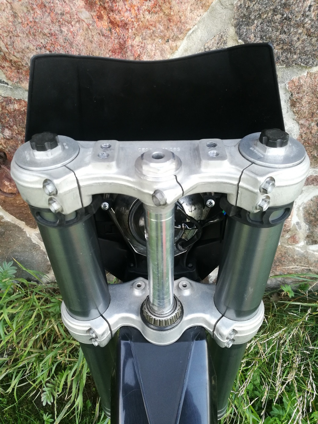Полностью регулируемый перевёртыш White Power. Верхняя траверса под жёсткое крепление руля, два положения креплений. Трубы 43мм, хром отличный, "ссальники"