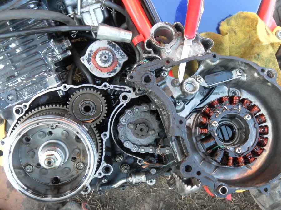 После отмытия керхером открылась полная картина маслом . Текло из под головы акурат над выпукными патруб посередине , гнало гдето под эл. стартером Даже на холстых из сапуна нагло капало масло , короче весь движок как решето -результат езды без коробки воздухана и возд фильтра , отсюда не возможность отрегулировать качество смеси и как следствие перегревы двигателя А учитывая что эта модель конструктивно самая теплонагруженная из-за "зажатой" ббаком головы , передним кроссовым крылом ограничивающим поток встречного воздуха ,спрятанным в ббак маленьким маслорадиатором и маслонасосом от предыдущих моделей - случилось то что и должно было произойти у не радивых хозяев. К этому времени мои друзья-товарищи(ВитекЗЮ и Лехацарь) помогли заказать Цилиндр ,поршень ,кольца ,палец ,кучу прокладок,маслосъем колп,мебрану с заслонкой, цепь ГРМ , патрубки айрбокса ,масляный насос от 3AJ(бОльшей производительности), сцепу и рем комплект для воостановления резьб и еще что то . Дима из Петрозаводска по моей просьбе прислал БэУшные :поршень 96.0 и 96.5 с кольцами и пальцем, два маслонасоса 1VJ , распред с шестерней и цепью ГРМ , рокера и кое что по мелочи. ... И начался процесс разборки (не полной пока)