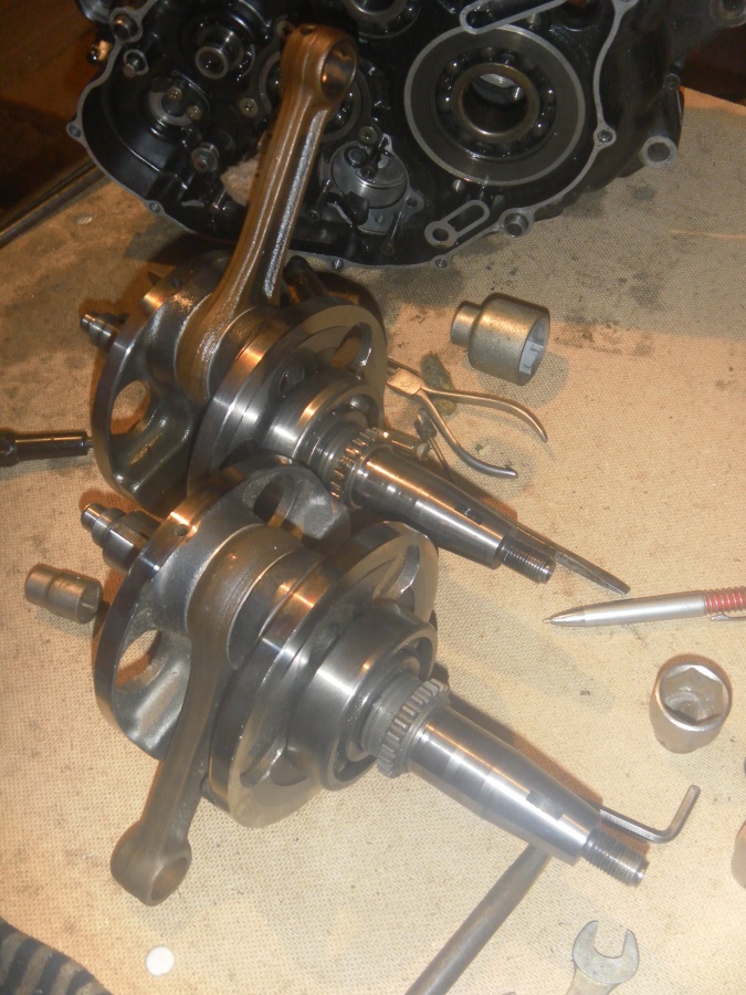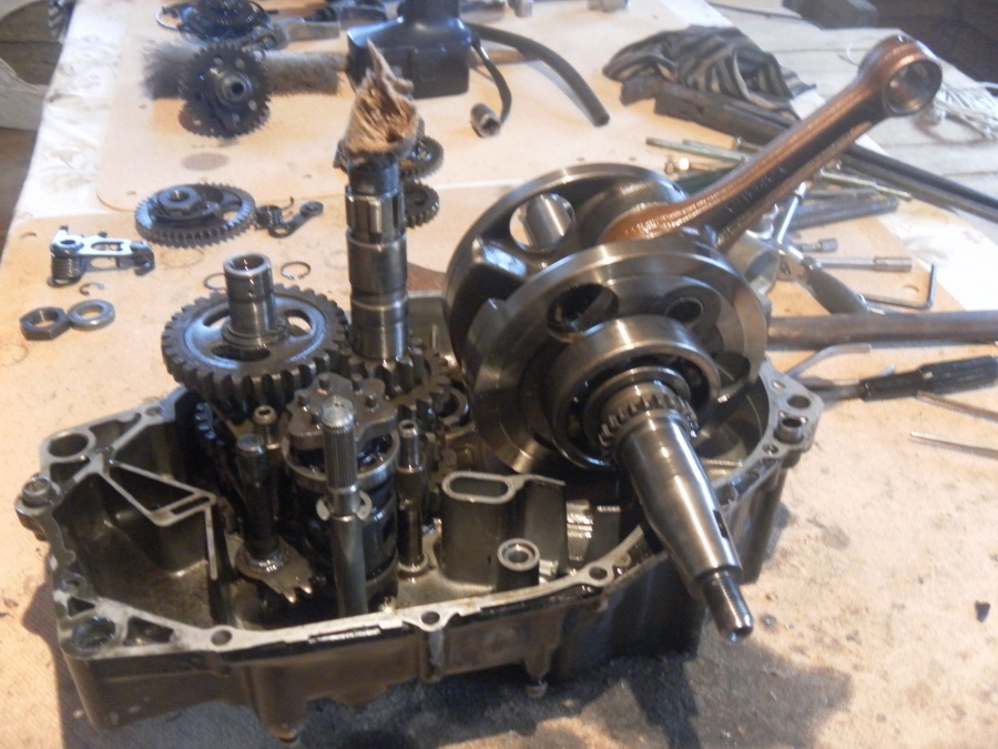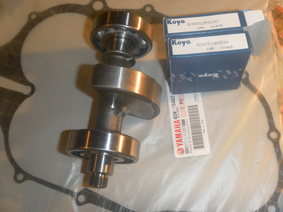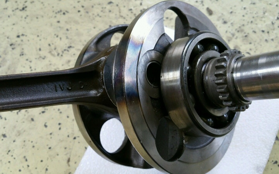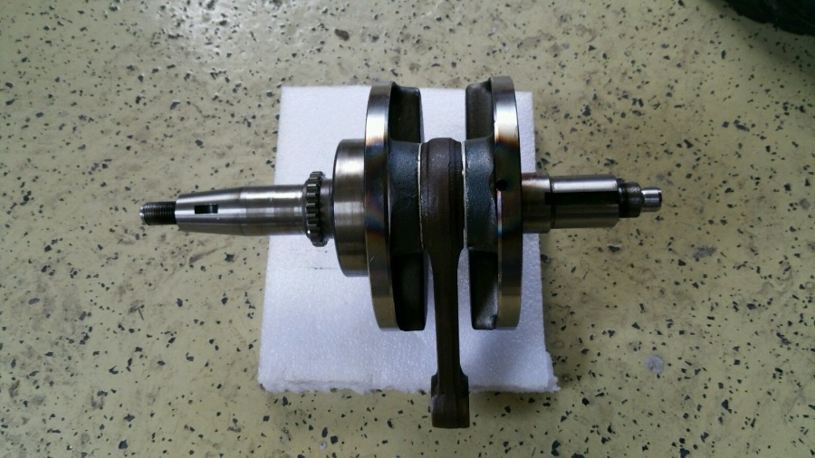 Вобщем при гремящем НГШ я скинул старую ЦПГ не обратив внимания на изношенную поверхность цилиндра ( ну старый - что с него спрашивать ... если номинал 95.0 а этот уже нужно под 96.5 точить) А посмотреть надо было и внимательно ,потому что уже были отметины (особенно на передней стенке гильзы) от стальной "чешуи" изношенного пальца , сепаратора , роликов . Всю эту кучу металлолома я вытащил из под защитного экрана маслянного насоса и полостей картера когда раскрыл половинки двигателя . Вскрытие маслоприемника показало что все в порядке - немного технического мусора , похоже на затвердевший лактайт используемый при сборке половинок картера . Для мота выпуска 90 г вполне нормально ...  я так думаю . и тогда положение еще можно было спасти "малой кровью" но ... Я поставил новый (800 зеленых денег)номинал ЦПГ и занялся обкаткой (убийством) . Можно долго рассказывать как бережно  я этим занимался ... Результат : Цилиндр в расточку , покупка новой ремонтной ПГ , замена масляного насоса . Ну и конечно не состоявшееся пусть небольшое но путешествие . Теперь главная задача : тщательная ревизия всех деталей и узлов , замена . Найти и купить шатун , перепрессовать и собрать практически новый движок . Пока я искал шатун позвонил Алексей Ц и спросил : ну как там  в Крыму ? Выслушав мою историю сказал есть оч хороший кол-вал по цене дешевле шатуна ... Чудеса !!! Но он в Германии и к нам врядли вышлют - санкции ... Я вспомнил что у моего оч хорошего друга-товарища  Балицкого А. .именно там живет сестренка . Один звонок и через 10 минут ответ : все - куплено !!! И вот он у меня красивый , блестящий , долгожданный (честно говоря не долго  ) как же я радовался :lol: ...а все мои предыдущие мощные не ломающиеся моты (не в обиду им будет сказано)  удивленно переглядывались  глядя на меня Новый и клиненный в НГШ коленвал . Можно теоретически посчитать(условно) если до расточки гильза ходит 50 000км то возможно "старичек пробежал 150 000км , но хуже от этого он не стал . Скорее всего буду восстанавливать (прессовать новый шатун)