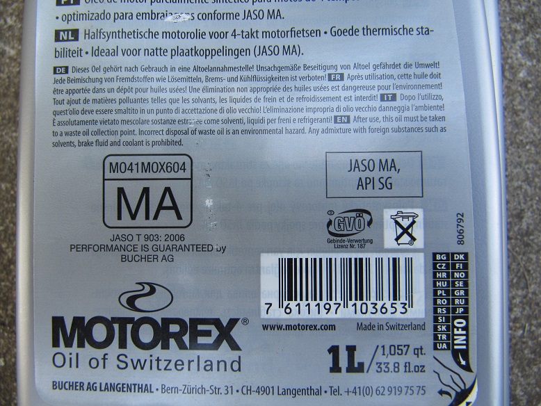 Zeiss, в 80/90-х я лил дизельное масло в Яву и ПС, но тогда времена другие были. Не понимаю к чему ссылка на "байкпост"? Я в любом случае доверяю рекомендациям мануала больше, чем умозаключениям любого блохера. Пусть льёт хоть нерафинированное - мне безразлично. При обилии выбора на современном рынке к чему эти эксперименты? Ради копеечной экономии? Чтобы купить масло на любой вкус мне требуется лишь 30 км до города проехать. Думаю, и ты не стоишь посреди дороги в каких-то ебенях без масла в движке. Агитировать никого не буду - каждый дро... строчит, как он хочет. Ты спросил про буквы, я ответил. П.С. Вот фото баклажки литровой. Купил её при переходе на Motorex, беру с собой на всякий случай. когда еду подальше от дома. До сих пор не вскрывалась за ненадобностью.  На последнем фото - описание на русском, которое находилсь под основной наклейкой.